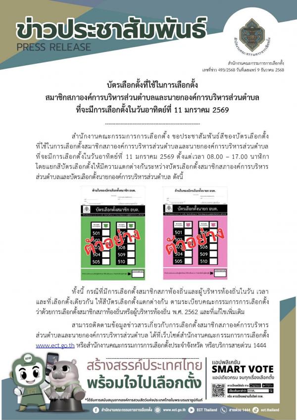 ขอประชาสัมพันธ์สีของบัตรเลือกตั้งที่ใช้ในการเลือกตั้งสมาชิกสภาองค์การบริหารส่วนตำบลและนายกองค์การบริหารส่วนตำบล ที่จะมีการเลือกตั้งในวันอาทิตย์ที่ 11 มกราคม 2569 ตั้งแต่เวลา 08.00 ? 17.00 นาฬิกา โดยแยกสีบัตรเลือกตั้งให้มีความแตกต่างกันระหว่างบัตรเลือกตั้งสมาชิกสภาองค์การบริหารส่วนตำบลและบัตรเลือกตั้งนายกองค์การบริหารส่วนตำบล ดังนี้