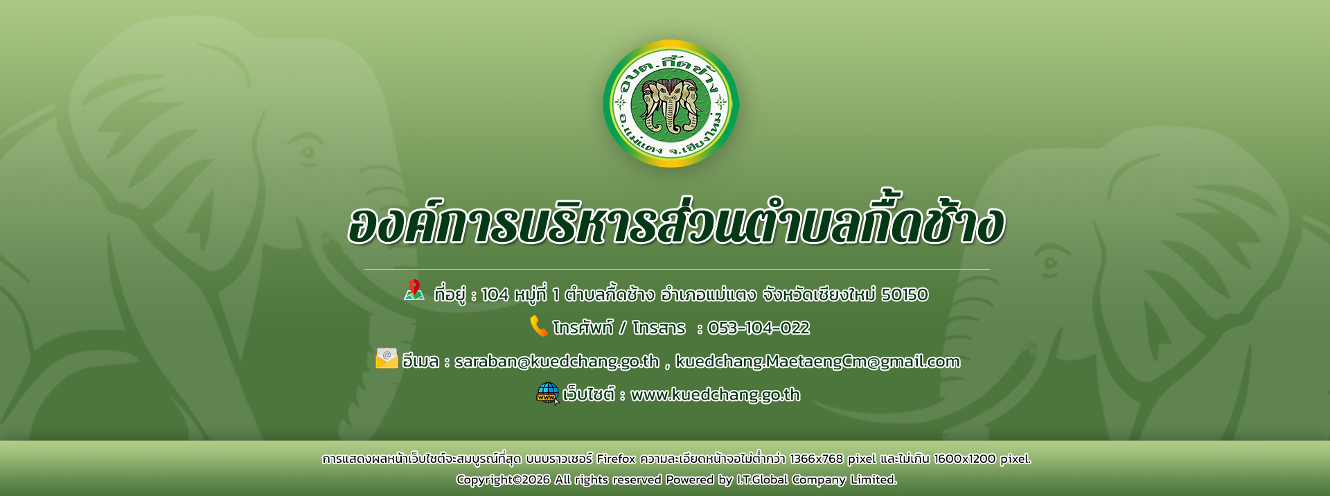 ยินดีต้อนรับเข้าสู่องค์การบริหารส่วนตำบลกื้ดช้าง ติดต่อสอบถาม : โทรศัพท์ / โทรสาร (แฟกซ์) : 053-104022 อีเมล : kuedchang.MaetaengCm@gmail.com , saraban@kuedchang.go.th